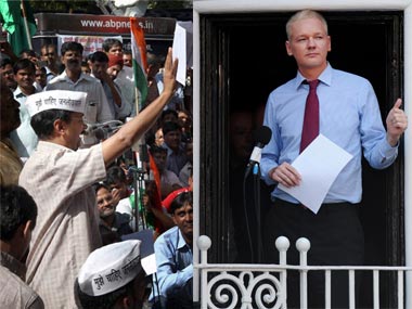 But it’s clear Kejriwal has learned well from the Wikileaks model of riding the news cycle. He announces upcoming scoops like television schedules, turning one explosive news event into a cliff-hanger television mini-series. He keeps his opponents guessing about what else he has up his sleeve. Jayanthi Natarajan wonders querulously why he does not reveal all he has in one go. It’s also clear that to the public he has indeed become, like Julian Assange, the go-to guy to expose all that’s rotten in the state. He is uncompromised and uncompromising. He tells India Today that people from all over the country are coming to him offering information about Robert Vadra and his shady deals. Asked who these people were India’s _aam-aadmi-_in-chief tells ET “Very ordinary people. Bureaucrats, some very senior bureaucrats… The second set that came to us on Robert Vadra and DLF came from farmers.” [caption id=“attachment_491124” align=“alignleft” width=“380”]  A combination of pictures shows Arvind Kejriwal and Julian Assange. PTI/AFP[/caption] The media should be squirming as R Jagannathan points out on Firstpost. Kejriwal, like Assange, has taken over their traditional role because whistleblowers think the media these days is more lapdog than watchdog. But once Kejriwal applies his megaphone to an issue, the media has no choice but to cover it – often with redoubled vigour as if to make up for their earlier timorousness. This week almost every Indian news weekly has Robert Vadra on its cover. Calling him India’s Julian Assange, MD Nalapat writes in the Pakistan Observer that “because of the popularity of those involved in the anti-corruption crusade, media outlets are afraid to censor the Kejriwals.” Kejriwal is being modest when he calls his work “small” because he takes on scams in NGOs and land deals in Haryana while Assange exposes the secret cables of nation states. But as Sandipan Deb writes in Mint, Kejriwal really changes the game because he shatters the “wink-wink nudge nudge conspiracy of silence” status quo of the political class. Just like Assange.