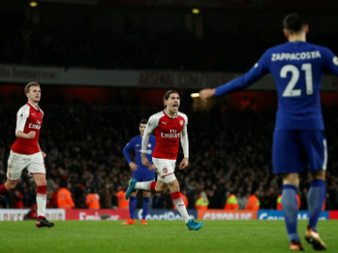 London: Hector Bellerin came to Arsenal’s rescue as the defender’s last-gasp strike earned a dramatic 2-2 draw in a heated London derby against Chelsea on Wednesday. [caption id=“attachment_4286399” align=“alignleft” width=“380”] Arsenal’s Hector Bellerin celebrates scoring their second goal. Reuters[/caption] Bellerin looked set to be the villain of the piece for Arsenal after the Spaniard’s foul on Eden Hazard conceded a penalty that allowed the Chelsea star to cancel out Jack Wilshere’s opener. When Marcos Alonso put Chelsea in front with just six minutes left at the Emirates Stadium, Bellerin’s misery seemed complete. But the 22-year-old enjoyed a sweet moment of redemption in the 90th minute as he lashed in only his second goal of the season. The frenetic conclusion to a thrilling encounter actually did little for either team’s prospects in the Premier League. Chelsea remain in third place, one point behind Manchester United and 16 adrift of runaway leaders Manchester City. Arsenal, who have now won only once in 13 league meetings with Chelsea, are languishing in sixth place, five points behind fourth-placed Liverpool in the battle to qualify for the Champions League. In an early sign of the drama to come, Alvaro Morata squandered a golden opportunity to put Chelsea ahead when Arsenal defender Calum Chambers completely misjudged a long pass. Morata pounced on the loose ball and sprinted clear but with only Arsenal goalkeeper Petr Cech to beat, the Spain striker scuffed woefully wide. Foreshadowing the penalty angst to come for Wenger, Ainsley Maitland-Niles had a spot-kick appeal turned down following Victor Moses’ challenge. It looked a good decision by referee Anthony Taylor however and there was more frustration for Wenger moments later. Alexis Sanchez wriggled into position for a powerful shot that Thibaut Courtois pushed onto one post, with the ball rolling agonisingly along the goalline, then hitting the other post before rebounding into the keeper’s arms. If that was a stroke of luck for Chelsea, there was no fortune about Courtois’s next contribution as he produced a fine save to deny Alexandre Lacazette after the Arsenal forward turned Gary Cahill and unleashed a powerful low strike. Arsenal’s Mesut Ozil almost opened the scoring just before half-time with a stinging drive that whistled narrowly wide. Conspiracies Cech was called into action twice in quick succession after the interval as he repelled Hazard’s low shot and palmed away Alonso’s header. Courtois was matching Cech save for save and the Belgian produced another brilliant block to stop Lacazette’s close-range effort. But the Chelsea keeper was finally beaten in the 63rd minute. Ozil picked out Rob Holding on the edge of the area and when the defender’s pass was deflected into Wilshere’s path, he reacted instinctively to drive his shot high into the net at Courtois’s near post. It was Wilshere’s first league goal since May 2015, although he might have been fortune to still be on the pitch after avoiding a second booking for a theatrical tumble just before he scored. Yet the crucial moment in a pulsating clash came just four minutes later. As Hazard twisted and turned inside the Arsenal area, Bellerin rashly stuck out a leg to halt his progress and Taylor pointed to the spot. Hazard stepped up to convert the 67th minute penalty for his ninth Chelsea goal this season. Gunners boss Arsene Wenger had ranted darkly about refereeing conspiracies after Arsenal’s Calum Chambers conceded a debatable penalty for handball in Sunday’s draw at West Bromwich Albion. The Frenchman has already been charged by the Football Association for his angry protests at the weekend, but his expression after the decision suggests another blast is in the offing. When Alonso timed his run perfectly to meet Davide Zappacosta’s cross with a cool finish in the 84th minute, it seemed certain Chelsea would start 2018 in winning style. But Bellerin was determined not to end the night as the fall guy and the wing-back pounced on Alonso’s weak header to crash in the equaliser. Even then there was almost a sting in the tale when Zappacosta smashed against the bar in stoppage-time.