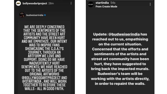 Apart from questions of ownership, a discordant note in the Budweiser vs St+art row arose from what many in the community felt was a disrespectful erasure of the original artists’ work, particularly since their consent had not been sought for the same. A Budweiser representative declined from sharing a statement with Firstpost on the issue. However, a source close to the matter asserted that the intention with the Messi murals was never to hurt sentiments. “Otherwise [If that were the case], why would [the brand] do what was done?” Online platforms discussing the art form — whether graffiti, street art, or larger murals — unanimously agree that the unwritten code is respect. But this comes with its own interpretations. While some opine that seeking legal permission and/or consent makes painting over another work fine, others say it’s an intentional sign of one artist directly indicating that they disrespect the other, especially if they don’t whitewash and cover only part of the preexisting art. In the case of a lack of walls, painting over is fair game as long as you know you’ve got the skill to match or one-up the previous. Still others say, pick another wall. [caption id=“attachment_9524001” align=“alignnone” width=“640”]  Statements from Budweiser and St+art India, via Instagram[/caption] Anpu Varkey notes that in graffiti culture, “people do paint over another person’s work. It has been done before many times, but that culture isn’t here in India yet. That’s when there is a scarcity of wall spaces.” She feels that in the case of the Budweiser murals, “the person who did this didn’t think it through.” For Mumbai-based artist Tyler, however, street art is meant to be impermanent. “You’re supposed to paint a wall and forget about it,” he told this correspondent. Undeniably, street art is impermanent. It does not have guardians or caretakers like art in museums or galleries, and is susceptible to natural wear and tear. It isn’t immune to repainting either. And in the Budweiser vs St+art row, perhaps the lines between art and advertisement aren’t very clearly defined anyway. For instance, Tyler noted that despite being a not-for-profit, St+art is “a mural company, they are an agency”. From the screenshot of an email shared by creative agency Animal, he speculated St+art India didn’t get the Budweiser project, and was therefore trying to publicly shame the brand. When Firstpost reached out to St+art India for comment, co-founder Arjun Bahl reiterated that “St+art India is an urban art organisation and an NGO. Our experiences, such as the Sassoon Dock Art Project and WIP Show, are free for all.” Bahl added that while the moral rights to any work of street art are retained by the artists and the intellectual property is shared between the artist and the organisation, “in general, we do public art with the vision that the final owners and keepers are the residents and citizens at large”.