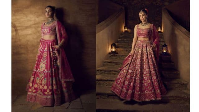 Anita Dongre ’s ‘Homage’ is an ode to a rich architectural history that is at once shape-shifting and inclusive. The collection reinterprets motifs and details in a range of crafts and techniques including Bandhini and Benarasi. ‘Homage’ spotlights alchemical shapes and patterns that transcend time. The juxta positioned curves of architecture and their linear historic ruin are brought to life by Serena Jethmalani, a young lawyer whose passion lies in the intersection of law and human rights. The geometry and play of colour on ancient tiles are modelled by Tiana Taraporvala who uses music as a medium to make people feel an emotional catharsis through her stories. Etchings that tell forgotten but distinct stories shine in the light of Sara Tendulkar who has a deep passion for research in the biosciences. With her organisational skills and intuitive mind, she has contributed in the development of skincare products with an international company. Rhea Kuruvilla who recognises how the industry of art is heavily dominated by men, has made it her mission to advocate harder for female-identifying South Asian artists, curators, and critics- it is her energy that brings the pieces in this collection inspired by tangible reminders of lives past- the documented and undocumented to the present. Alaviaa Jaaferi, a fashion influencer, and entrepreneur lends her charm to highlight the transience of time- in architecture and human will. In each piece photographed the woman featured has chosen elements to customise her lehenga and make it her own– a service long cherished by Anita Dongre brides. Anita Dongre’s stories with craft and bespoke services which include customisation make every piece uniquely personalised. Incorporating a special colour, a word or piece of text of shared meaning, or any elements that personalises a piece to its wearer has added to the special occasion each lehenga is chosen for. Adding a bride’s personal story to a signature design gives each piece a place in time. In ‘Homage’ the old and new step into the sun together, hand in hand.