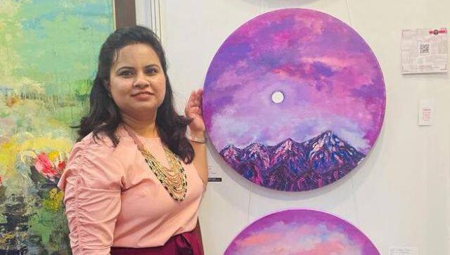 Manoj Kumar Swain from Bengaluru with his hyper-realistic paintings Neha Dua, 38, Kanpur Neha, who has been painting for the last seven years now, and whose works have been exhibited across India, Dubai, and last year was also presented in the 7th Geoje International Art Festival at the Haegeumgang Theme Museum, Geoje, Republic of Korea, is presenting her work for the third time at IAF. She feels that even if she tries to begin with, say a yellow, it is “always the blues and purples” that she ends up arriving at. “These are meditative moods,” she says about her paintings. “These are the dominant colours when you’ve achieved mastery in meditation,” she continues, before concluding that her paintings depict “her journey. I don’t think while I draw. And I believe that my paintings connect easily with people who understand how meditation works, for it’s not an everyday language that people understand. Also, they make it loud and clear to the viewer: you’re not at the centre.” In her own words, the paintings can be interpreted this way: “The sun and the moon, they guide me, and this mountain is that I’m trying to conquer. And the choice of circular canvas is also deliberate. It’s the core of the philosophy behind this work: Everything ends where it begins.”