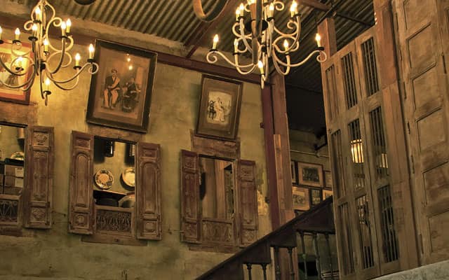 The stairwell is clad with aged ship planks that retain the original character. The windows with antique coloured glass and wooden shutters bring that sense of Indianness that is so very Sona. The walls adorn her art collected over the years and the chandelier is from Ironworks our vintage collective.