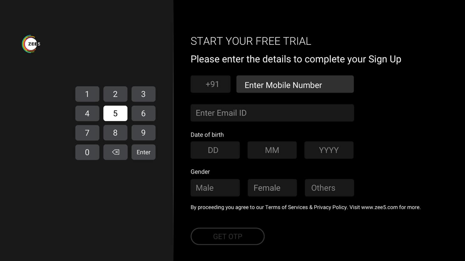 - Click on GET OTP. An OTP will be sent to the mobile number provided by you. Enter this OTP on your TV screen