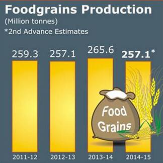 As compared to last year’s production of 265.57 million tonnes, current year’s production of foodgrains is lower by 8.5 million tonnes. This decline has occurred on account of lower production of rice, coarse cereals and pulses due to erratic rainfall conditions during the monsoon season of 2014.