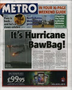 . The next day, on a train a daughter was trying to convince her mum that the storm had received such a distinct name. “Why would they call it that?” asked the mum. The daughter showed her video on her phone of a newscast where it referred to the storm as Hurricane Bawbag. “No, that’s been dubbed over.” Only when someone holds up the front page of The Metro [pictured] newspaper across the aisle does the mum finally believe it. Many news outlets did not acknowledge the name in their coverage of the damage to buildings and power outages, but used it as a bit of side entertainment. But the key line spoken by the daughter on the train was this: “If everyone starts calling it that, you have to call it that.” [caption id=“attachment_153316” align=“alignleft” width=“380” caption=“Click for full sized image”]