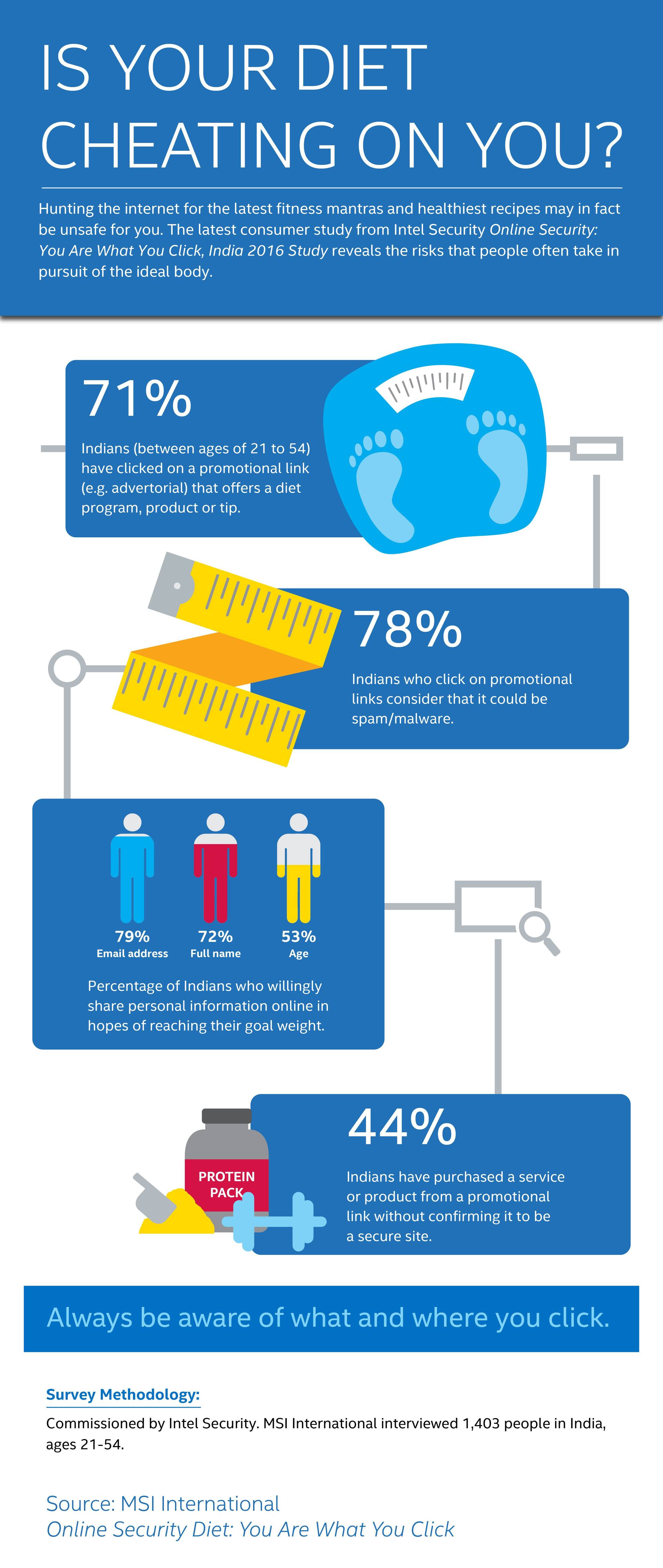 Guess what do most youngsters and other surfers look for while online? It is about the body. No, not on those lurid lines of what you are thinking as you are reading this. Youngsters online are desirous to have an ideal body. Those between age group 21-30 years are more likely to click on promotional links around diet tips and programs and constitute 77 percent of this chunk. And if the promotional link or article features or endorses a celebrity, then around 70 percent of respondents are more likely to click the article. So curious and keen are these surfers that they are willing to sacrifice their online security and identity if it takes them a step closer to achieving desired results. [caption id=“attachment_2747358” align=“alignleft” width=“380”]  Representational image. Getty images[/caption] The flip side to this craving for knowing more about fitness is that cybercriminals exploit this need by creating phony weight loss ads leading unsuspecting people into digital traps. A vast majority of the people (78 percent) that click on link for diet programs/ tips/ products did consider that it could be spam/malware. That said, 44 percent of survey respondents have purchased a service or product from a promotional link without knowing whether or not it’s a secure site These finding were released today by Intel Security today from its new study, Online Security Diet: You Are What You Click which examines the online behaviors and attitudes of Indians ages 21 to 54 toward dieting clickbait. The research was conducted in April 2016 by MSI International via an online questionnaire to 1,403 people in India, age 21-54. The study had 15,000 consumers participating in the study globally. It reveals that when it comes to the desire for the ideal body, people may be willing to click without exercising caution. But the risk is that cyber criminals exploit this need by creating phony weight loss ads leading unsuspecting people into digital traps. “Findings from our study indicate that Indian millennials (aged 20-30) are conscious about their diet, and they tend to rely on information available online for quick diet fixes, and cybercriminals are increasingly exploiting this behavior for their own benefit.” said Venkat Krishnapur, Head of Operations for Intel Security’s India Engineering Centre. “The study decodes the seasonality of consumer search habits, creating awareness about the importance of safe searches online. It points to the importance of being able to correctly identify potentially risky sites and emails. This is why we continue to invest in ongoing education efforts to reinforce strong habits helping consumers enjoy safer experiences online.” It is a bizarre world online with many respondents stating their willingness to share information like email address (79 percent), full name (72 percent) or age (53 percent) with a website, service or company in hopes of reaching their goal weight or dream body. A significant number of respondents indicated that they would also share their home address (28 percent), credit/debit card details (13 percent), or even a photo in underwear/bathing suit (e.g. before/after shots) (6 percent). Yet one out of four respondents (25 percent) admitted that they didn’t know how to check if the website was secure before providing payment details or personal information Here are a few steps that you could adopt to keep yourself safe online: Click with caution: When you see offers from sites that seem too good to be true, such as Lose 5 Kgs. in one week, don’t click merrily. Check! Check! Check! Websites or emails might include phishing links that can lead you to websites that lure you into giving personal information to cyber criminals or download malware to your computer Browse safely: Beware of phony websites. Sites aimed at scamming consumers may have an address very similar to a legitimate site, like Wait Watchers opposed to Weight Watchers. Phony sites often have misspellings, poor grammar or low-resolution images. If a site asks for personal information, double check the URL, and make sure it’s the site you intended to visit and not an imposter. Use a web reputation tool that can help identify risky sites and inform you that you may be about to visit one Develop strong passwords: Do away with the ‘123321’ password, and use a strong one, like ‘9&4yiw2pyqx#.’ Regularly change passwords and don’t use the same passwords across all your accounts. As a way to improve the quality of your passwords, consider using a password manager Stay up to date: The best security software updates automatically to protect your computer. Use the manufacturer’s latest operating systems and allow security patches to be updated on an ongoing basis. Also ensure you have the appropriate software set to conduct routine scans Use a comprehensive security solution: Protecting all your devices with a comprehensive security solution that can help shield you from malware and other cyber attacks.