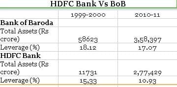 From 1999-2000 to 2010-11, there has been a sharply superior performance by HDFC Bank. At the start, it was a small bank - with a balance-sheet of just Rs 11,731 crore while BoB was roughly five times bigger. By the end, HDFC Bank was at a balance-sheet size of Rs 277,429 crore while BoB was at Rs 358,397 crore.