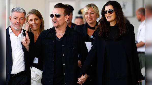 Lead singer of U2, Bono with his wife Ali Hewson arrive in Venice for the wedding of George Clooney and Amal Alamuddin on Saturday. REUTERS