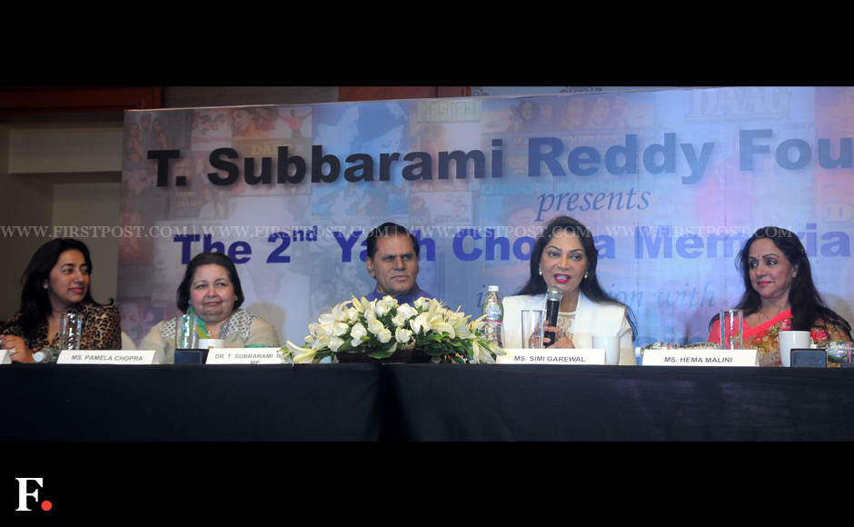 (From left) Anu Ranjan, Pamela Chopra, Dr Subbirami Reddy, Simi Garewal and Hema Malini at the 2nd National Yash Chopra Memorial Award press conference. Sachin Gokhale/Firstpost