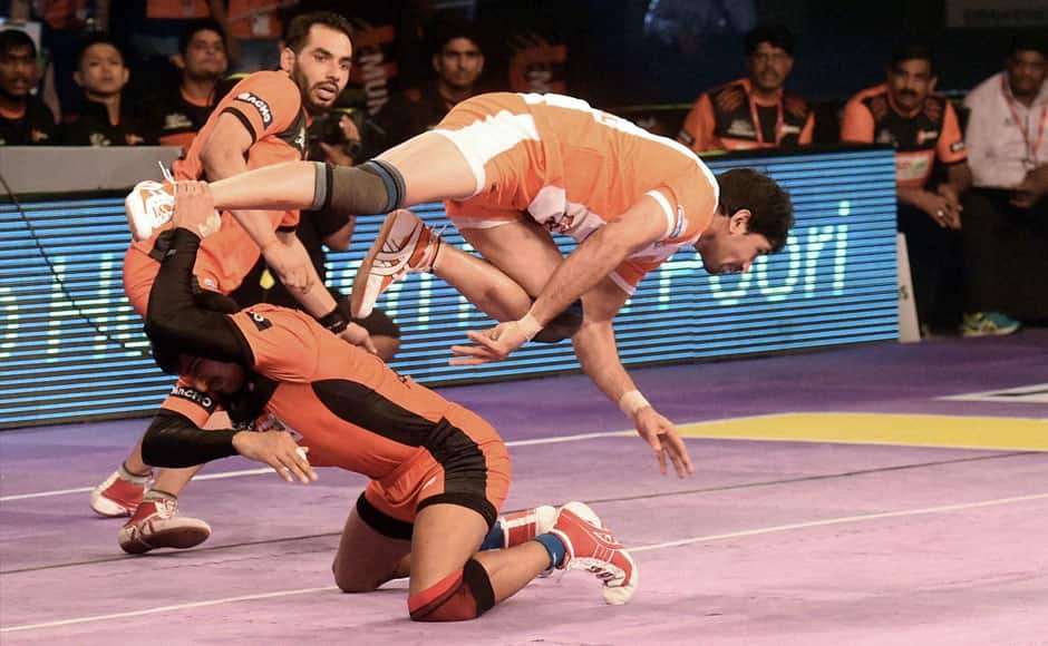 Mumbai: Players in action during a Pro Kabaddi League match between U Mumbai(Orange) and Puneri Paltan(Orange and white) in Mumbai on Monday. PTI[/caption] [caption id=“attachment_2356004” align=“alignleft” width=“940”]