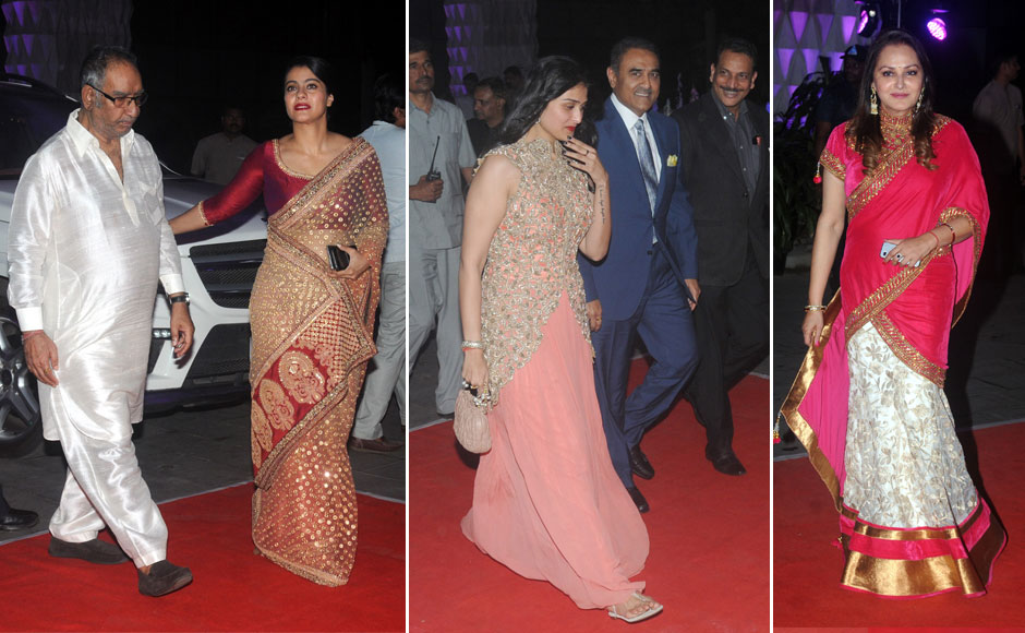 Kajol attends Kussh’s wedding reception with father-in-law Veeru Devgan. Also in this photo, Praful Patel with daughter Poorna and Rajiv Prasad Rudy and Jaya Prada. Sachin Gokhale/ Firstpost