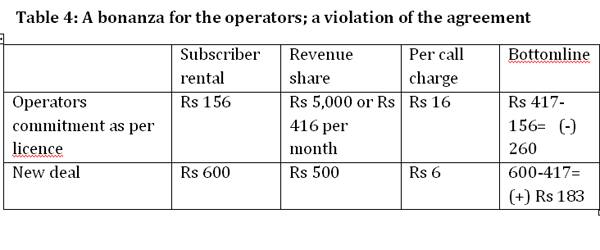 ( SeeTable 4 above) shows how by raising the subscriber fee to Rs 600, the government made it possible for the operators to pass on the entire extra payment burden on to the subscriber. Ordinary subscribers, or users of mobile phones, paid the money and the operators just raked it in. Indeed, they would make Rs 100 per subscriber and even if the per call charge was zero, they would make money.
