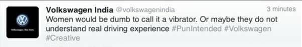 “Women would be dumb to call it a vibrator. Or maybe they do not understand real driving experience. #PunIntended #Volkswagen #Creative” was the update by @VolkswagenIndia.