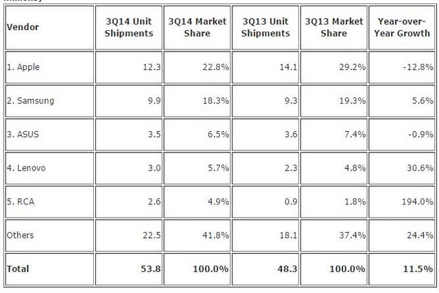 Lenovo fell back to the number 4 position with 3 million units. It is worth noting that Asus and Lenovo traded the positions they held in 2Q14.