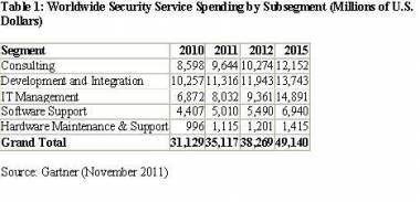 Worldwide security services spending is on pace to reach $35.1 billion in 2011, up from $31.1 billion in 2010, according to Gartner, Inc. The market is forecast to total $38.3 billion in 2012, and surpass $49.1 billion in 2015.