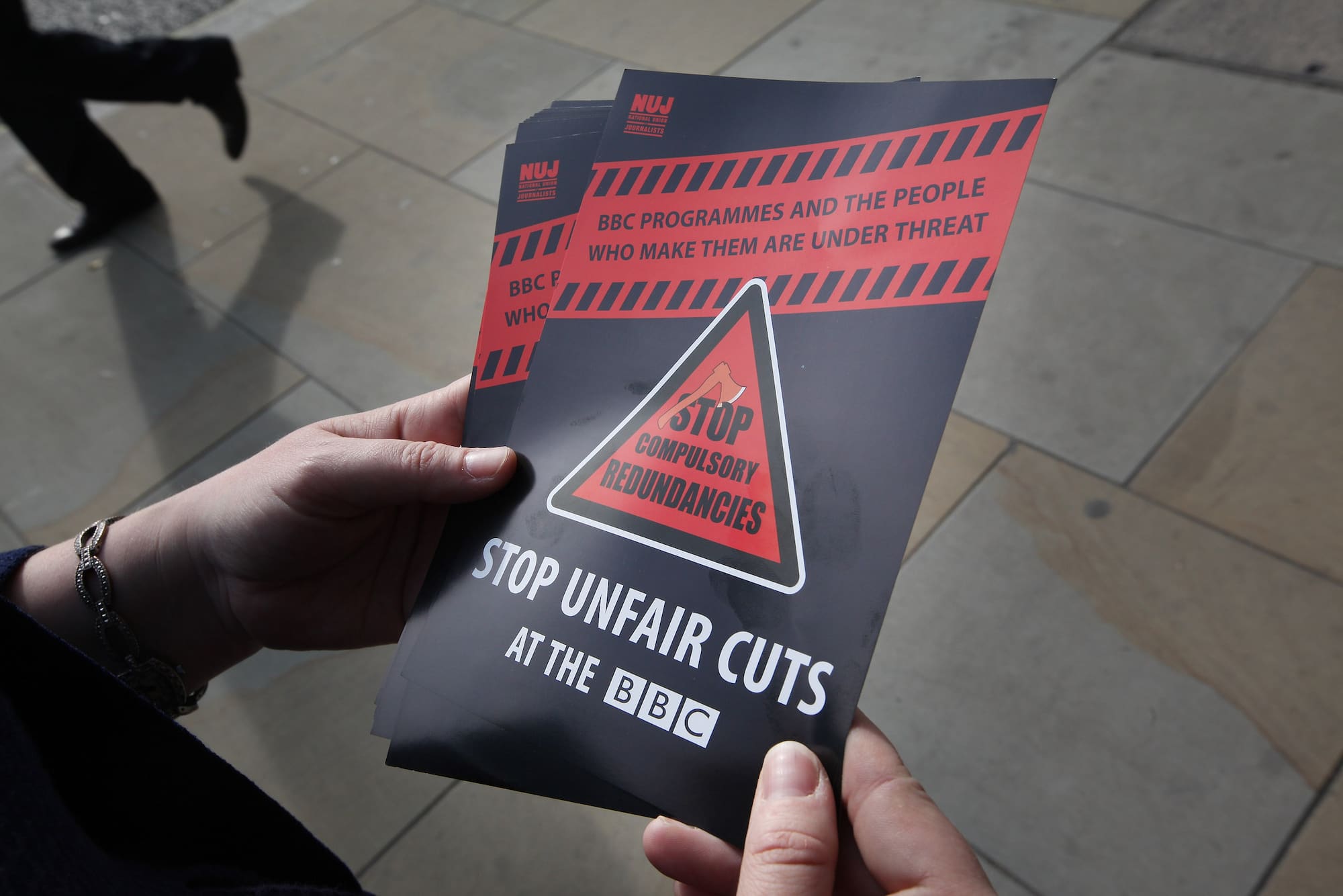 [caption id=“attachment_100960” align=“alignleft” width=“300” caption=“A striking journalist hands out flyers at a picket outside British Broadcasting Corporation (BBC) Television Centre on 1 August in London. Getty Images”]  [/caption]