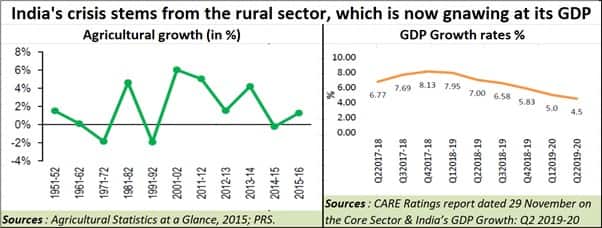 Revival through the rural sector Why should the farmer be so crucial? There are at least three reasons which explain why the rural sector is crucial for an economic revival. First, remember that 50 percent of India’s population depends on agriculture. When 50 percent of India’s population of 1.3 billion depend on this sector, the government just cannot ignore it. It is part of the economy, even if it contributes just 14 percent to India’s GDP. Also remember, that the rural economy contributes only 14 percent because its produce is priced very low. Pay 50 percent of the market price, and the contribution of this sector will swell to 25 percent. Second, do appreciate the fact that unlike all the Asian tigers—South Korea, Singapore, Taiwan and the like—which grew because they were export-oriented, India is not an exporting economy. It is a consumption story. So if consumption is good, industry does well, and it can export as well. Hurt consumption, and you hurt industry and you also hurt exports. And that brings us to the third inescapable realisation that consumption depends also on the 650 million people staying in rural areas. That this 50 percent of India’s population is a purchasing community. It needs to purchase seeds, fertilisers, cement for houses and canals, harvesting equipment, tractors and motorcycles among others. And it purchases consumer products as well. If this 50 percent loses purchasing power, it purchases less. That hurts industry, and the slowdown can become acute. That is why the purchasing power that the rural sector enjoys is crucial for India’s economic revival. That is also one more reason why the Budget should categorically warn frenzied mobs who stop meat wagons under the specious excuse that the meat could be cow’s meat. Much of the meat coming to the market currently is buffalo meat. If the government want to protect cows, do so, but why hurt buffalo owners? In any case, in states where this gau rakshak madness has become frenzied, most farmers are switching over to buffaloes. That helps also because buffalo milk has more fat content. So the farmer gets more money for buffalo milk than for cow’s milk. But when a meat wagon is stopped, even if the trader’s life is dpared, the meat becomes rotten, unfit for human consumption, if it lies around for more than a few hours. The trader loses money, and he resolves not to purchase old cattle from farmers any more. The trouble is that the farmer gets around Rs 20,000 for each old cattle head. If he cannot sell the old buffalo, he loses Rs 20,000. He used to add another Rs 20,000 (sometimes even by borrowing this sum) to purchase a new buffalo. Now he cannot do so because the seed capital of Rs 20,000 is not forthcoming. Worse, he has additional expenses because he has to look after old cattle. As a result, the farmer loses purchasing power. The leather and beef industries which are both employment generators and forex earners lose money, and the economic depression becomes more severe. ![bovine](https://images.firstpost.com/wp-content/uploads/large_file_plugin/2020/01/1580389705_bovine.jpg) The losses on account of the ban on bovine slaughter could be costing the farmers—on the aggregate—anywhere between Rs 18,000 crore to Rs 30,000 crore (see table above). And this is without counting the losses in future income for the farmer, the losses caused to the cobbler and the leather merchandise industry and to the carabeef industry as well. It is time this madness is stopped, because one of the reasons for farm distress is the squeeze on cashflow and revenue generation because of these frenzied mobs who seek to stop meat wagons. The Budget must make a mention of this if the government want to show the country the solution to achieve an economic revival. Dear Finance Minister, you know how the country is hurting. And if you look closely, much of this hurt is on account of the distress in the rural sector (see chart). ![RURALCRISIS](https://images.firstpost.com/wp-content/uploads/large_file_plugin/2020/01/1580390103_RURALCRISIS.jpg) Some of this could be explained away as administrative oversight. Some of it may require a policy rethink. And some of it has to do with law and order, and the need to ensure that cash flows of the rural sector, the leather industry and the carabeef export industry are not adversely affected. Do this, and the government can hope for an economic revival within six months—the farming sector will become buoyant, and cash flows will return. That will trigger purchasing power, and in turn the wheels of industry will begin to move faster. (The writer is a senior journalist. He tweets @rnbhaskar1) Follow full coverage of Union Budget 2020-21 here