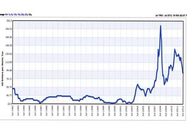 The chart maps the price of Australian coal from 1982 to the present. It can be clearly seen that coal prices till 2002 were fairly cheap, and traded in the narrow range of $25 to $30 a tonne. At this time, the cost of production in India too was just $30, which barely gave private players any room to rake in profits. Hence, at the time, even if the natural resource was given away free, the chances are the government would not have made a killing from auctions.