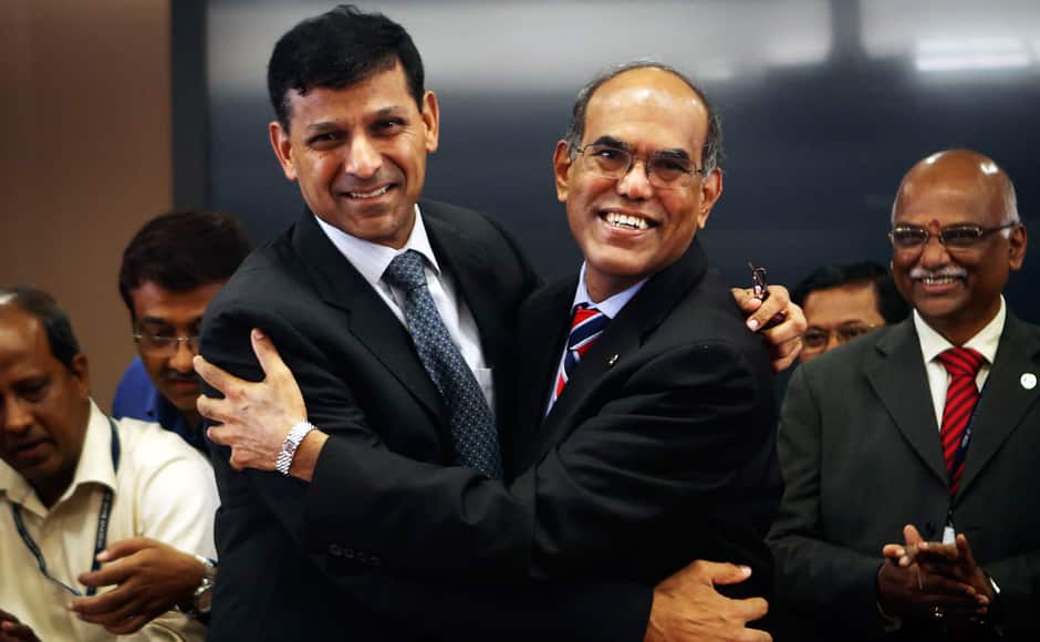 [caption id=“attachment_108475” align=“alignleft” width=“940”]  Raghuram Rajan (L), newly appointed governor of Reserve Bank of India (RBI), hugs the outgoing governor Duvvuri Subbarao during the taking over ceremony at the bank’s headquarters in Mumbai[/caption]