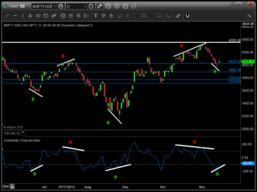 When it happened in the past the markets caught a bounce. Past instances of positive divergence is shown by the green arrows on the chart. Divergences often work. Look at the red arrows on the chart that showed negative divergence - price rising, CCI falling - and the markets fell soon. So now would be a time for bears to switch to a bullish stance. In case the markets continue to fall the support areas below are marked by the blue horizontal lines.