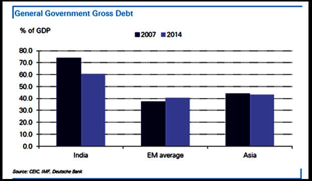 in December 2013: “In reality, quantifying deficit and accumulated debt only as a percentage of GDP has the potential to misguide. In isolation it distorts both, the true scale of fiscal profligacy and the government’s debt-servicing ability.” What Shastri is effectively saying here is that the government does not have access to the entire GDP to repay its debt. It repays its debt only out of the money that it makes every year through taxes and other sources of revenue. How is the Central government doing on that front? In 2007-08, revenue receipts stood at 10.87 percent of the GDP. By 2013-2014, they had fallen to 9.06 percent of the GDP. As far as tax collections are concerned, they have fallen from 8.81 percent of the GDP to 7.36 percent of the GDP. This year tax collections are expected to be at 7.59 percent of the GDP. This number is unlikely to be achieved given that the shortfall in tax collections is expected to be around Rs 1,05,084 crore or around 0.84 percent of the GDP. The non-tax revenues of the government have also fallen from 2.05 percent of the GDP to 1.70 percent of the GDP between 2007-08 and 2013-14. During this financial year the number is expected to be at 1.65 percent of the GDP. Interestingly, the interest that the government pays on its accumulated debt was at 3.43 percent of the GDP in 2007-08. It has jumped to 3.79 percent of the GDP in 2013-2014. An increase in interest payments means lesser money gets spent on other important things. As economists Taimur Baig and Kaushik Das of Deutsche Bank Research point out in a recent research note: “India’s Central government spends nearly a quarter of its total spending on servicing the large debt burden…Bringing this down would create valuable space for other far more important expenditures.” What these numbers clearly tell us is that the ability of the government to service the debt that it has accumulated has been coming down over the years, which is clearly not a good sign. Also, when compared to other emerging market countries, India has one of the highest government debt levels in the world, as can be seen from the following table.