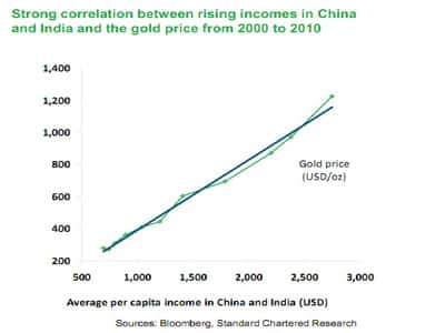 [caption id=“attachment_65595” align=“alignleft” width=“400” caption=“There’s a strong correlation between rising incomes in India and China - and gold prices. Courtesy: Standard Chartered Research”]  [/caption]