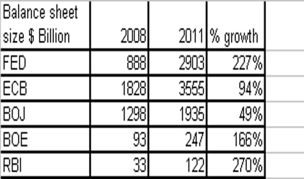 The RBI has expanded its balance sheet the most among central banks in the aftermath of the 2008 credit crisis, and is set to expand it further in 2012 as the government looks to the central bank to fund its fiscal deficit.