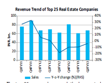 “The net profit of the top 25 real estate companies has consistently declined in the last seven quarters, from Rs 1,303 crore in Q4FY11 to Rs987 crore in Q2FY13,” the report said.