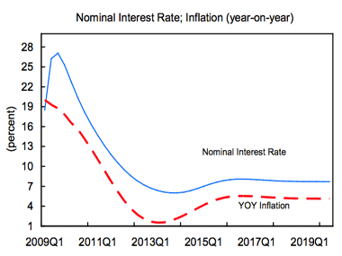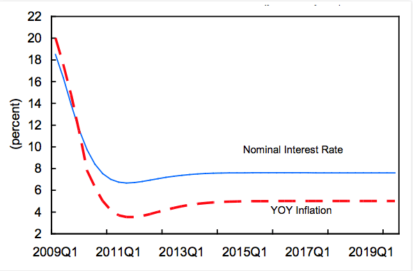 This is much nicer story. The nominal interest rate starts out high (18 percent) but inflation responds rapidly and the interest rate can also come down rapidly. By 2013, inflation is at the target. The cumulative damage to GDP growth, in this process of exorcising inflation, works out to only 4 percent of GDP.