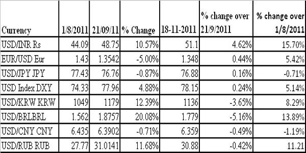 The performance of the dollar since 21 September until date is even more striking.The rupee has fallen 4.6 percent over the period, while other emerging currencies including the real, rouble and South Korean won (KRW) have actually gained against the dollar.
