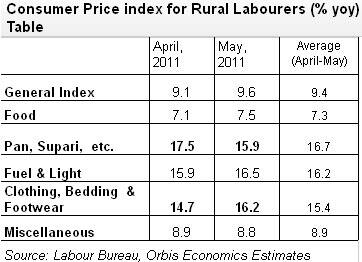 Components of the price index such as paan, supari, tobacco and intoxicants as well clothes, bedding and footwear have seen a sharper-than-overall rise in inflation in the recent past. The average year-on-year price increase for the first two months of 2011-12 was 16.7 percent for the “paan, supari, etc” component of inflation, and 15.4 percent for “clothing, bedding and footwear”.