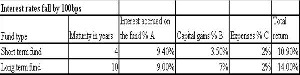 What will be the expected return of a short-term fund and a long term fund over a one year period when interest rates fall by 100 basis points or 1 percent?