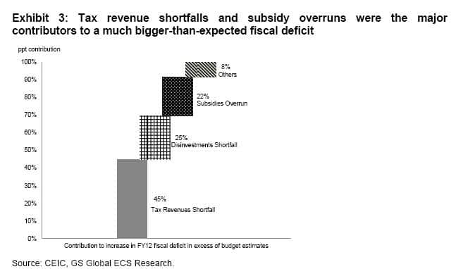 From the original target of 4.6 percent, the central government’s fiscal deficit is expected to balloon to almost 5.6 percent in the financial year ending March 2012. According to Goldman Sachs, 45 percent of the increase in the fiscal deficit can be explained by tax revenue shortfalls, while another 22 percent was caused by unbudgeted subsidy increases (see chart below).