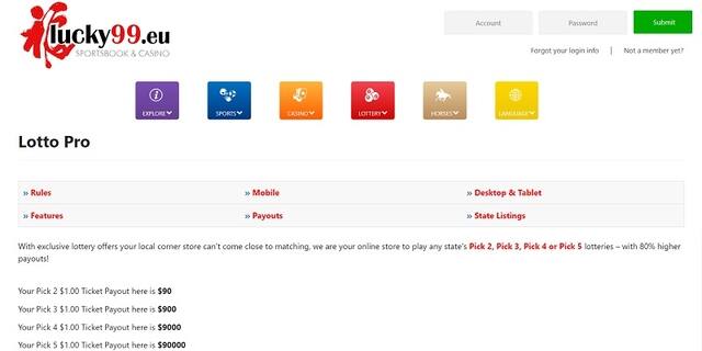 All things considered, we’ve picked Lucky99 as the best lotto site online. It’s super entertaining, and it puts you in control of the risk you want to take. There’s even a welcome bonus for new players! Let’s have a closer look! Lottery Options: 4.95/5 As we said, you’re in charge of how risky you want to play things at the Lucky99 lottery, ‘Lotto Pro’. There are four levels to choose from: ‘Pick 2, Pick 3, Pick 4, and Pick 5’. These refer to how many selections you’re making and how many numbers you’re choosing from. For example, if you choose to ‘Pick 4’, you’ll be selecting from the numbers 0000 through 9999. You’ll also need to select whether to play ‘Straight’ or ‘Boxed and a couple of other options, so make sure you read the rules before you get started. Bonuses: 4.9/5 It’s not common to see welcome bonuses at online lottery sites, but Lucky99 is offering an exciting 25% matched deposit bonus for all new players. There’s also the chance to take part in a couple of extra offers, such as an extra 25% through the Lucky99 Rebate Program and a free deposit on every seventh payment, up to an impressive $5000. Support and Banking: 4.85/5 Players will be pleased to hear that Lucky99 offers a 24/7 live chat function that they can use to get help whenever they need it. We tried it out for ourselves and found it to be pretty responsive, which is an encouraging sign. You can also call them if you prefer; they have dedicated mobile numbers for different regions. The banking side of things isn’t bad either, as there are a few ways to pay. Lucky99 supports deposits with a handful of cryptocurrencies (Bitcoin, Bitcoin Cash, and a few others), credit cards, electronic checks, and money transfers. Withdrawals include most of these plus a couple more, but it should be noted that it’s not possible to withdraw to a card, so you’ll need to make other arrangements. User Experience and Other Features: 4.9/5 The Lucky99 website looks pretty good for the most part, but we did notice that the layout of the actual lottery section could be perceived as a little confusing at first. It won’t take too long to get used to, but it’s not the most intuitive design. If you want to play on a mobile device, you’ll need to use the mobile site instead of an app, but that doesn’t make too much of a difference in this instance, as you won’t be missing any features. Final Score: 4.9/5 With this much versatility and a great bonus, there’s no wonder Lucky99 made it to the top of our list today. » Claim your 25% welcome bonus [Lucky99]