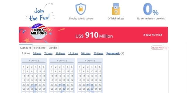 The Mega Millions is one of the world’s favorite lotteries due to its stunning jackpot amounts, and now you can play it online with ease, thanks to GoLotter. Lottery Options: 4.9/5 Right now, the Mega Millions jackpot stands at over $900,000,000 . That’s a truly mouth-watering amount of money. In fact, it ranks up there with some of the biggest lottery jackpots of all time. The downside to this is that the actual odds of landing a win in the first place are lower. You could consider this to be a highly volatile lottery. That’s not to say there isn’t a fair range of betting options though. You can still choose to buy tickets between 2 lines and 25 lines, plus there are syndicates and bundles available. Bonuses: 4.85/5 There’s not so much going on in the way of bonuses here, but players can still enjoy discounts when buying multiple lotto tickets online at the same time. The multi-draw option can get you up to 25% off if you opt for the 52-draw option. Support and Banking: 4.85/5 You’ll be able to get Mega Millions support by reaching out to the GoLotter support team. They’re available round the clock, and we found them to be quite helpful when we tested them for ourselves. When you’re funding your account, there are a handful of options but not as many as our top two so far. Players can bank with debit cards, credit cards, and bank transfers. User Experience and Other Features: 4.75/5 Mega Millions is best accessed through GoLotter. This is a ‘courier service,’ and it allows you to buy lottery tickets through a very neat mobile app, downloadable on the App Store or Play Store. Or, you can get them through the equally good-looking desktop site. Your call. Final Score: 4.8/5 Mega Millions is an incredibly exciting lottery. If you like the sound of it, head over to the courier service GoLotter and give it a go for yourself. » Play Mega Millions for a multi-draw discount of up to 25%