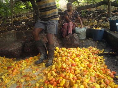 Cashew apples being squashed in Chorao, Goa. Frederick Noronha/Wikimedia Commons[/caption]