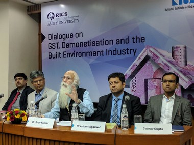 Much has been discussed, argued and debated on demonetisation and the Goods and Services Tax (GST) implementation at various forums including election campaigns. Opposition parties slammed both the moves of Prime Minister Narendra Modi, though the latter managed to hit headlines on Thursday again after the Pew Research Centre’s survey announced him as ‘very popular’. Without taking names or giving political colour, a panel discussion on ‘Dialogue on demonetisation, GST and the built environment industry’ organised jointly by RICS School of Built Environment, Amity University and National Institute of Urban Affairs (NIUA) on Thursday evening (16 November) in New Delhi, attempted a threadbare analysis of the impact of demonetisation and GST on the real estate sector. In his inaugural presentation, noted economist Arun Kumar, Malcom S Adiseshiah, Chair professor, Institute of Social Sciences pointed out that the present form of GST was not ‘full GST’ as it kept real estate, alcohol, electricity and petroleum out of its ambit. “Now, if tax to GDP ratio rises, it’ll give rise to inflation. As a result, demand will fall and the rate of growth (will) decrease, which is contrary to what GST promised. The small and unorganised sector has been ignored and this sector can’t deal with GST due to its complexities. While demonetisation has put the economy on the downslide, the GST implementation has aggravated the condition. The poor have been marginalised in the process. Demonetisation and GST are the two big shocks,” he remarked. On the possible impact of demonetisation on large real estate projects, Prof Kumar said demonetisation had resulted in decline of growth rate and GDP, and rise in deficit. “As the government won’t like fiscal deficit to go up, the demand in the sector will go down.” [caption id=“attachment_4213899” align=“alignleft” width=“380”]