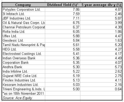 _Firstpost_did some quick analysis of the top dividend-yield offering stocks as on 18 November. We have limited our universe to the BSE-500 index to ensure that we track only financially sound companies. However, specific shares like HCL Infosystems, Patni Computers and India Bulls Financial Services were excluded from our list because they gave a one-time special dividend. Also, only stocks that offered a dividend of 5 percent or more were included.