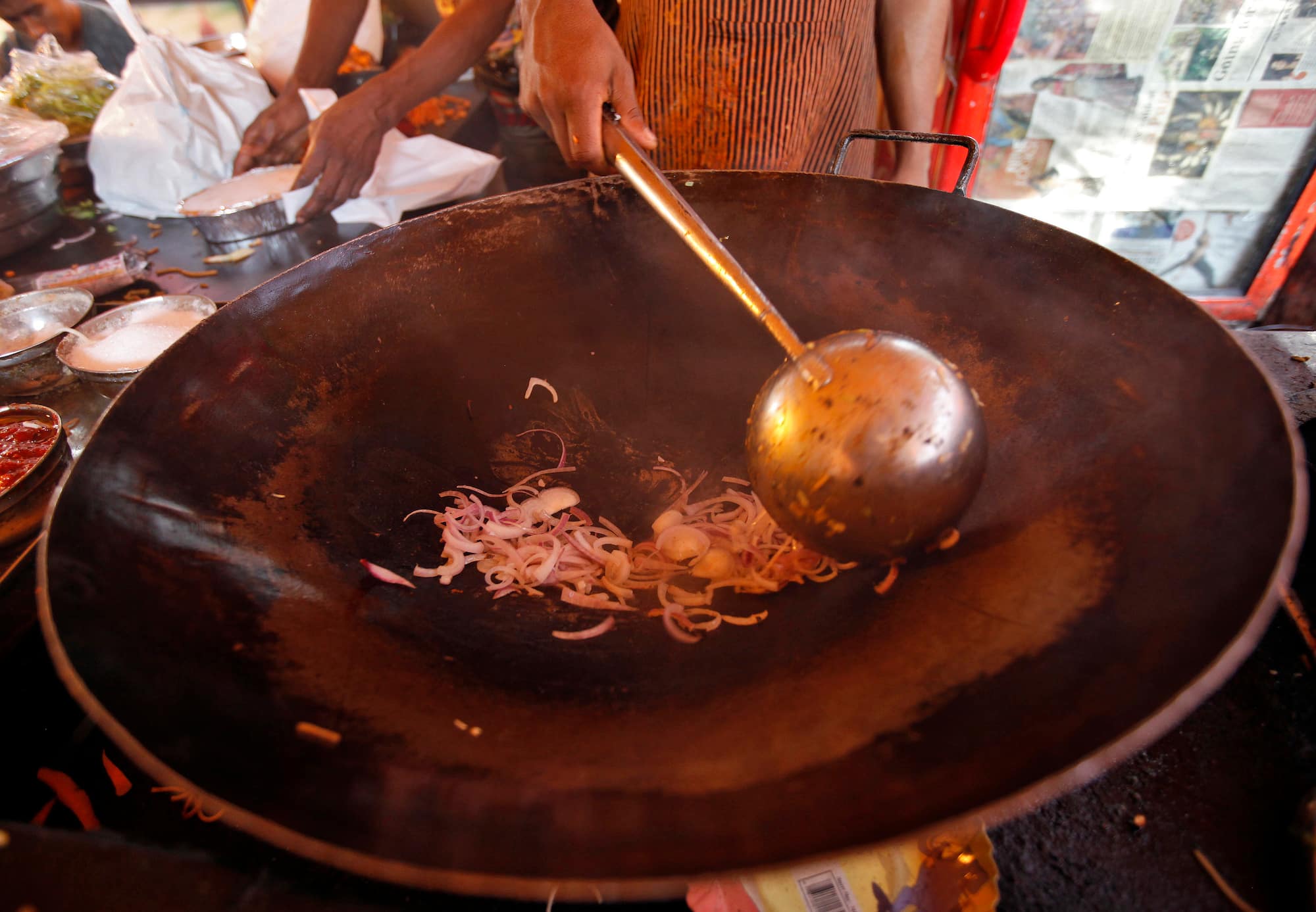 A cook fries onions to put into vegetable chowmein at a beachside restaurant in Mumbai. Reuters[/caption]