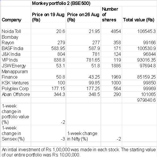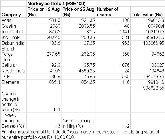 While the Sensex dropped 3 percent between 19 August and 26 August, our Monkey portfolio 1 - comprising 10 randomly-picked BSE 100 stocks - slipped a marginal 0.1 percent.Our Monkey portfolio 2- consisting of 10 randomly-selected BSE 500 stocks, shed 2 percent.