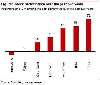 Nomura says Infosys denies its internal problems regarding hiring, business strategy or regulatory issues and keeps blaming its performance on the external environment which will not work. Infosys is losing out on commodity or cost efficiency business and is not getting enough cost efficient to lay the high volume market. It will turn around if discretionary spend on IT goes up, uses its cash better, sorts out the Visa issues and gets more competitive in the commodity segment.