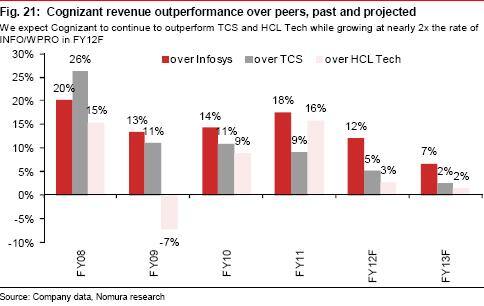 Cognizant’s cutting of 2012 guidance has given rise to skepticism over if it can sustain its strong stock performance. Discretionary spend on IT has gone down and sure demand has fallen. But Nomura expects Cognizant to continue to gain market share, aided by an aggressive low margin requirement. Add to this a 20 percent revenue growth guidance which is achievable according to the research house, and Cognizant will maintain its outperformance over the peers.