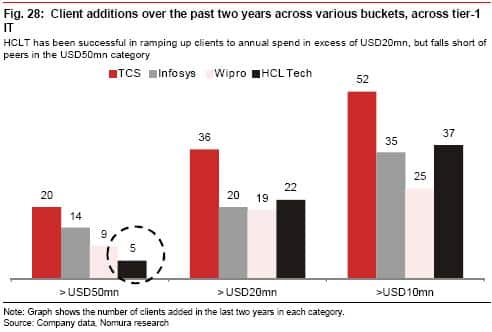 HCL Tech has outperformed the Nifty by 16 percent over the past one year mainly due to high revenue growth. This is likely to continue as it has low margin thresholds and is strong in infrastructure management services where the order flow is heavy. But in the long term it will have to succeed in maintaining and growing clients beyond the size it has already reached (20 million dollars) which likes of Infosys and TCS have shown in the past.