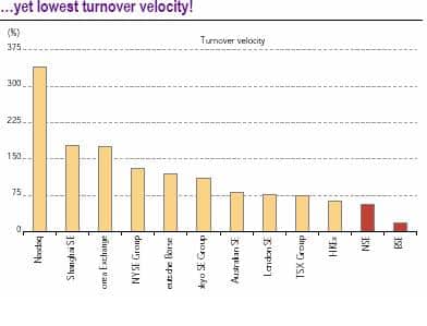 According to the report, India’s largest exchange - the National Stock Exchange (NSE) - has a turn over velocity of 57 percent while the Bombay Stock Exchange, one of the oldest in Asia, has a turnover velocity of 18 percent, sharply lower than the 340 percent in developed markets like the USA for the cash segment.