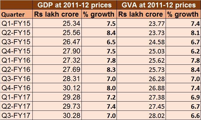 The third quarter GVA stood at 6.6 percent, also better than expected. This is against 6.7 percent (revised) in the previous quarter and 7 percent (revised) a year ago. For the full year 2016-17, GDP has been seen at 7.1 percent.
