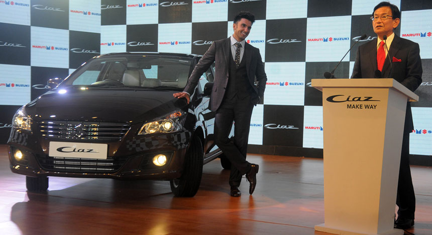 [caption id=“attachment_103380” align=“alignleft” width=“860”]  Ranveer Singh with Mr. Kenichi Ayukawa MD & CEO Maruti Suzuki India Limited. Millions of Indians have enjoyed Maruti cars for years. These customers are looking to upgrade to mid-sized sedans. Ciaz is for them," Ayukawa said. Image: Sachin Gokhale/ Firstbiz[/caption]