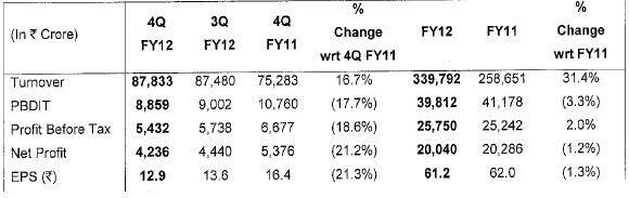 Reliance Industries reported a net profit of Rs 4,236 crore for the quarter ended March 2012, slightly below market expectations of Rs 4,300 crore. The profit is 21 percent down from a year ago and 4.6 percent down from the previous quarter.