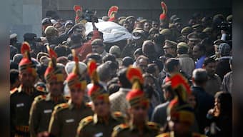 From left to right: MoS for Home RPN Singh, Delhi Chief Minister Sheila Dikshit, Union Minister Ajit Singh, and Delhi Police Commissioner Neeraj Kumar during cremation of constable Subhash Chand Tomar in New Delhi. PTI