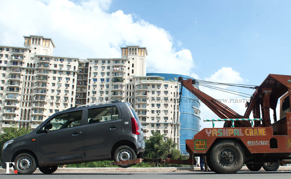 The Gurgaon traffic police deployed a large number of tow away vehicles or recovery vehicles at every nook and corner of the dedicated zone. Image Credit: Naresh Sharma/Firstpost