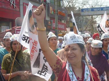 New Delhi: As giveaways go, the Aam Aadmi party does not have that much to hand out to curious onlookers. Some literature, the Aam Aadmi cloth caps and for a lucky few, a jhadoo. But a freebie is a freebie. “Bhaiyaa ek topi la do (Brother, get me a cap),” a street urchin in a grubby ‘Being Human’ t-shirt asks. I ask him if he knows whose picture is on the banners. “Kejriwala,” he says confidently. We are standing on a street corner in the busy Rani Bagh area of NorthWest Delhi waiting for the first day of Arvind Kejriwal’s Delhi road rally. This is a busy middle class shopping area with old Punjabi standards like ‘Chadha Handloom, No.1 Patiala Salwar and Leggings’ alongside the ‘Laging Hi Laging’ store as well as newer arrivals on the block like ‘The Republic of Chicken’ franchise. [caption id=“attachment_1460949” align=“alignleft” width=“380”]  Kejriwal and Ashutosh look more like unlikely bridegrooms: Sandip Roy/Firstpost[/caption] Kejriwal himself does not have the sheen of the new kid on the block from a few months ago. That was before he became the 49-day wonder. Now there’s a touch of skepticism. Sudha, a middle-aged housewife, stands at the edge of the crowd. She was out for a little “marketing” she says and got sucked into the road rally. She says she supported him but the Somnath Bharti shenanigans and Kejriwal’s resignation gives her pause. “He is a kachche khiladi (a green player)” she says doubtfully. “Too impatient.” But she still holds a handful of marigold flowers someone has thrust into her hand to shower on Kejriwal. She has not given up on him completely. “I sense a second undercurrent,” says AAP volunteer Swaraj enthusiastically. “Especially after coming from Ahmedabad. I think Ashutosh will win here 100 percent. He’s a down-to-earth person.” When candidate Ashutosh and Kejriwal arrive the crowd goes wild. Festooned with heavy marigold garlands and big red turbans, the duo look more like an unlikely couple of bridegrooms instead of political candidates. Kejriwal looks sunburned from days on the campaign trail. He seems pumped and confident but the shadow of those 49 days still lingers. He comes back to it again and again in his stump speech. “To leave a chowkidar’s job requires a lot of hardship,” he says. “But to leave the chief minister’s job requires kaleja.” At another point he says it requires jigra (heart). He is making a virtue out of the runaway label his opponents want to pin on him. “Lord Ramachandra was lucky the BJP was not there when he went into exile,” he says. “Otherwise they would call him a runaway too. “ Same with Raja Harishchandra. “I am not running away to Pakistan,” he says responding to Narendra Modi’s jab. “I am not running away anywhere. I am staying right here. If I wanted to go to the Lok Sabha, I could have gone from Delhi. I am not going to Varanasi because I want to go to the Lok Sabha. I am going to Varanasi because I want to defeat Narendra Modi.” And then in case anyone accuses him of being only anti-BJP he adds, “And Kumar Vishwas is going to Amethi to defeat Rahul Gandhi. Only the can we liberate this country from mehengai.” This Kejriwal is more aggressive than his mild-mannered well-behaved bureaucrat persona from the Delhi Assembly elections. He knows the freshness of his candidacy will not work anymore. He has to demonstrate results. “Did your electric bill not come down?” He asks the crowd. “Did your water bill not come down? I did that for you but only till March 31.” Now the BJP and Congress, who he alleges are in cahoots with the electric and water companies, will double the price he warns. His rhetoric works for 21-year-old Sachin Sindhu who has been following his work since his Magsaysay award days. He likes the fact that Kejriwal is not attached to his chair. He says he was attracted to Modi for awhile but then read up more about him and decided the Gujarat story was not as rosy as Modi was painting it. As for Kejriwal’s impatience, he is okay with it. “Josh is not bad,” he says. “As long as it is for good.” [caption id=“attachment_1460981” align=“alignleft” width=“380”]  Kejriwal still inspires the crowds although the shadow of his 45 days still lingers: Sandip Roy/Firstpost[/caption] Raj Kumar selling bananas in a cart agrees. He is wearing his Aam Aadmi cap proudly. He says he has lived in Delhi for 28 years and he thinks Kejriwal is the one politician who can make a difference. “His rallies still work. The rickshaw drives tell me the last ones were so crowded even they could not get through.” Ironically Raj Kumar is a casualty of his hero’s popularity. His banana stand has to be moved to make way for the crowds following Kejriwal’s motorcade. It’s clear that while polls show mixed prospects for Kejriwal, he remains an inspirational figure for all kinds of people – from elderly sardarjis with hearing aids to fresh out of school youngsters like young taekwondo champ Deepika Chandel. Deepika is one of the AAP supporters who actually filled out a form to become an AAP MP candidate. Her father, Amar Singh an ex-service man says he didn’t have much to give his daughter. But he took up Kejriwal’s challenge to find 1000 candidates for the party. When his daughter asked if she could be one he said he had to agree. “I wanted to tell her that if you really want it nothing is impossible in life,” he says. Deepika didn’t get the nomination but she’s here with her broom to cheer for Ashutosh who did. Kejriwal has always relied on this kind of starry-eyed enthusiasm. However that was easier to come by when he had no political track record. But Mayur Kapur, a chartered accountant who has skipped out of office to come to the road rally, says he is still optimistic. “Maybe he is not ready for office at the centre yet. That is a big thing. But if 20 of AAP candidates win, that’s 20 ho